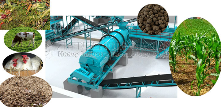Combination granulating process basically includes: Fermentation of organic materials, crushing of decomposed materials, mixing of organic and inorganic fertilizers, granulation, drying, cooling, screening, metering and packaging.